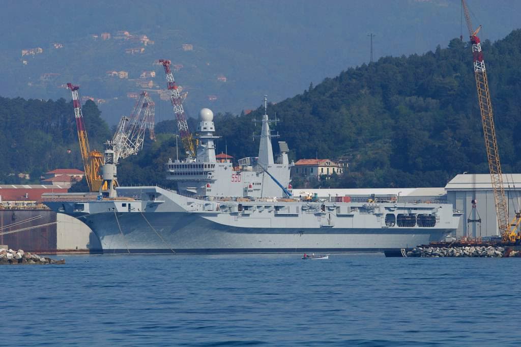 Giovanni Maduliย sent meย this picture of the Italian aircraft carrier Cavour (550)ย he took recently in Fincantieri’s shipyards inย Muggiano, nearย Genoa.ย ย The ship, thatย willย be delivered to the Marina Militare (Italian Navy) in 2008,ย has an overall length of 244 metersย and aย runwayย 180m x 14m with a 12ยฐ ski jump that will be able to serveย 8 V/STOL (Vertical/Short Take-Off and Landing) aircraft such as AV-8B+ Harrierย or 12 helicopters, such as the EH-101, NH- 90 or SH-3D.ย The ship will be fully compatible with the F-35ย Joint Strike Fighterย VTOL variant and will most probablyย accomodate a mixed force composed by both aircraft and helos.