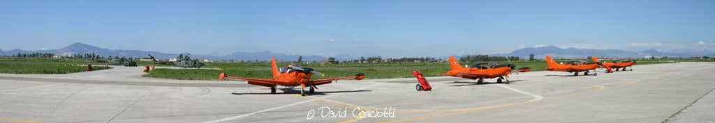 Grazzaniseย 04.03.04ย SF-260 of the 70th Stormo, deployed to Grazzanise lined-upย in theย 609th Squadriglia Collegamenti apron next to theย Squadriglia’s AB.212AM