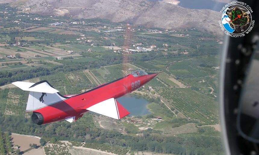 On Sept. 19 2003, I flew an airborne pickupย with Col. Miniscalcoย (with anย MB.339ย carryingย tip + pylon tanks) in orderย to rejoin with the F-104 MM6930 on the day of the roll-out of the 9-99.ย We correctlyย rejoined with the “Picca 01” flown by Lt. Col. Strozza, but G-forces involved were higher since weย were compelled to cut the finalย turn to catch up with the clean Starfighter.