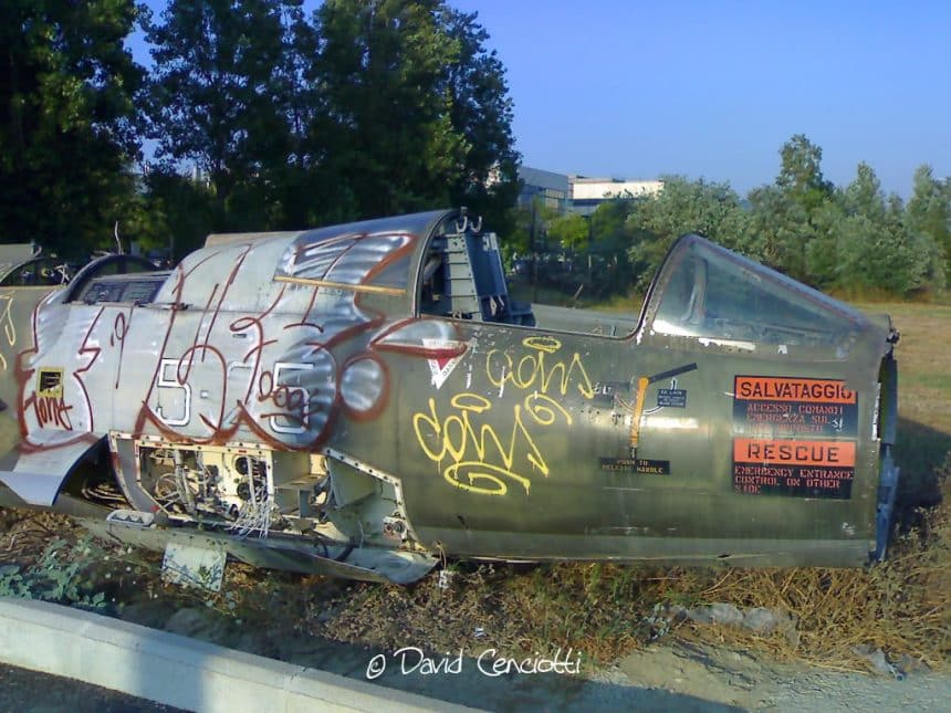 Today I visited this scrapped F-104 next to Warner Village cinemas, in Rome. For those interested it is located at 41ยฐ49’01,49”N 12ยฐ24’49,07”E but don’t waste time looking for it in Google Earth since satellite pictures do not depict the Starfighter in its current position even though, according to the information I gathered, it is was first noticed in Via Parco de’ Medici in July 2006. The aicraft is in a supermarket parking area located next to the TI complex and it is (at least apparently) completely abandoned. As pictures taken with my Nokia N70 phone show, now it is almost completely cannibalized and covered with graffiti. Even if initial configuration is unknown it currently misses most of its pieces: wings, tail, canopy, nose, ejection seat, etc. The aircraft is an F-104S ASA wearing code 5-25 and serial MM6833. Most probably it is one of the Starfighter that were retired years ago in Rimini and cut in accordance with CFE treaty. Bentivoglio ( http://www.brunobentivoglio.it/) purchased each chunk and joined them together almost randomly to sell the aircraft in its famous scrapyard to collectors and enthusiasts. This is the reason why both MM6833 (tail) and nearly all the ‘104s at Bentivoglio military surplus yard near Bufalotta exit of the G.R.A. ring road are composites: nose, centre section and tail comes from different aircraft.