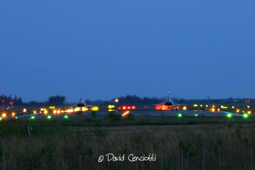 Here’s the answer: since it was getting dark, I set ISO speed to 200 and the Tv mode (shutter speed priority) of my Canon EOS 10D to 10 seconds letting the camera automatically deciding lens aperture basing on the information from its light meter. If it was pitch black I would have used 400 or higher ISO and up to 30 seconds of shutter speed. I decided for the partial metering since edges of the scene were dark and I thought this method was better for the situation than the spot metering or evaluative. With the shutter open for such a long period I had to use a tripod and the self-timer, in order to prevent camera from shaking (with consequent blur). I wanted to get both aircraft with the afterburner but I had no idea how long they would be aligned on the runway before starting the take-off roll. With 10 seconds of countdown of the self-timer and 10 seconds of exposure I had to wait 20 seconds between one shot and the second one. So, as soon as the aircraft were aligned I made the first shot but the aircraft did not move. 20 seconds later I tried again. This time I was lucky enough to get both aircraft with the afterburner lit, with the leader, rolling on the left, and the wingman, lined up on the right, moments before moving.
