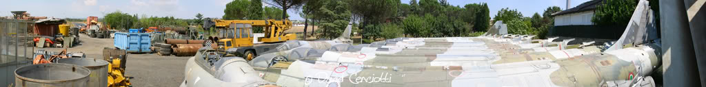 On August 07th I visited the famous Bentivoglio military surplus yard (http://www.brunobentivoglio.it/), located at the Bufalotta, next to the GRA, in Rome, and I was given permission to wander in the scrapyard and make some pictures of the aircraft, helicopters, drones, engines, tanks, rocket launchers, and various equipments and parts currently there. Many F-104 are still there and also some G.91Y as this panoramic picture shows: