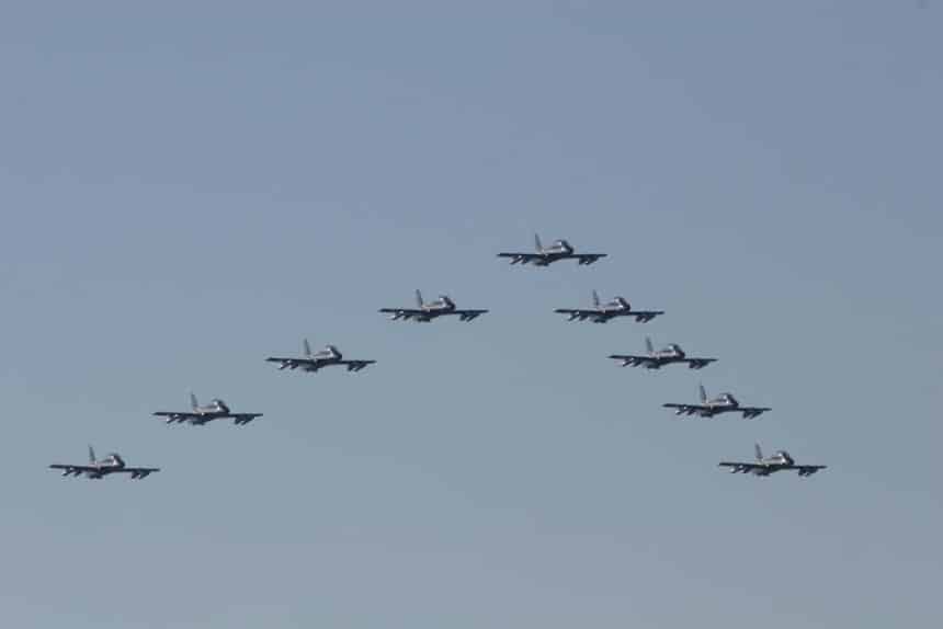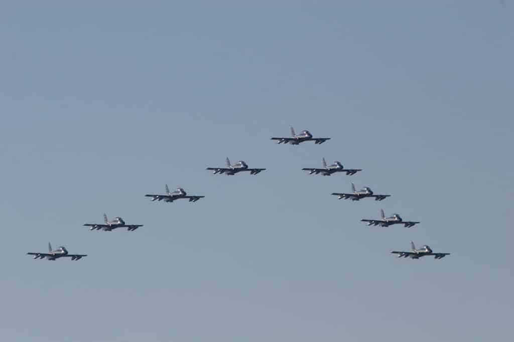 I have just received from Giovanni Maduli the following pictures depicting the Frecce Tricolory display team during the fly by above Rome for the Armed Forces Day. You will notice that the formation flew with some โunmarkedโ aicraft something usual during the “training period” (from November to May 1st). For the reasons why the Frecce fly sometimes with blank tails, read my previous post: Why doย the Frecce Tricolori fly with blank tails?.