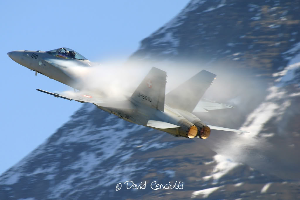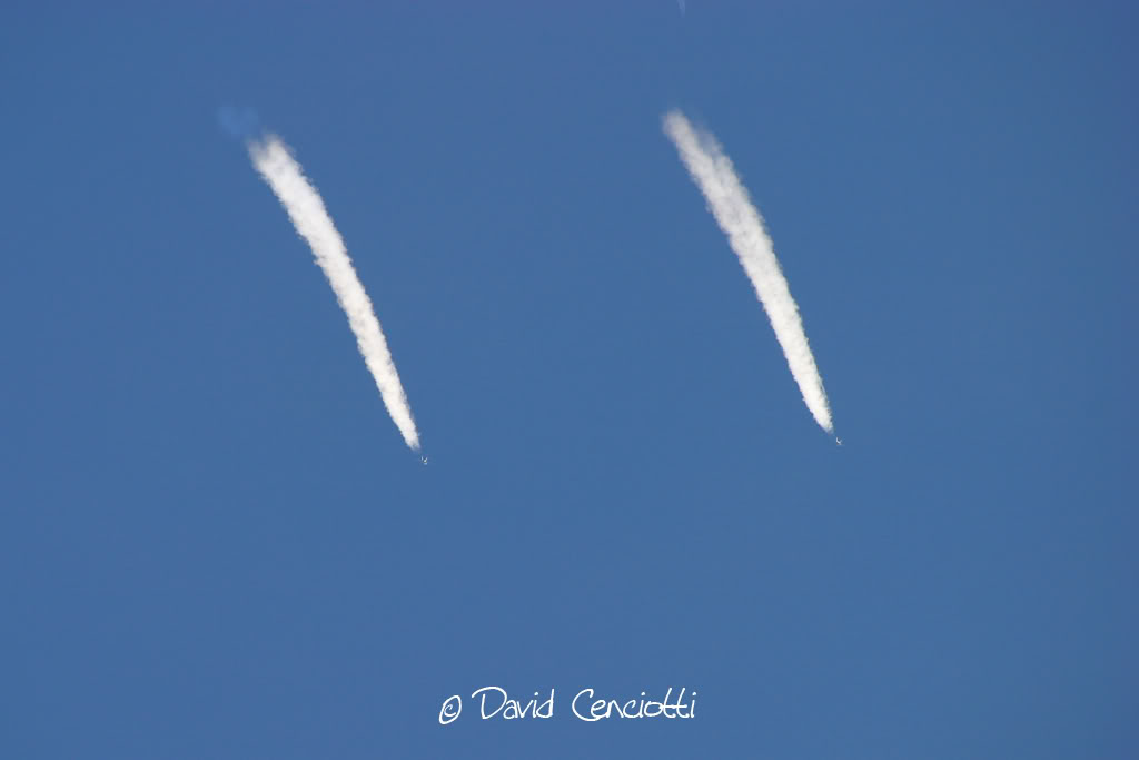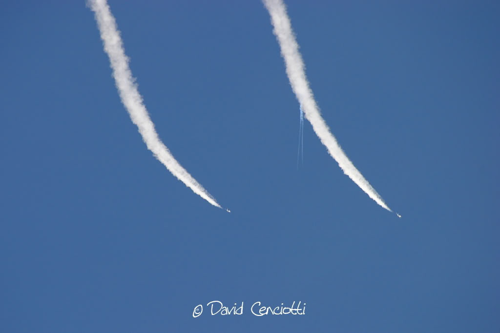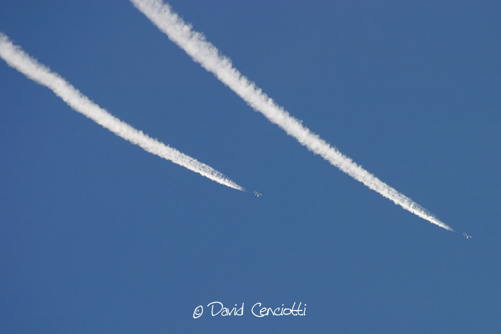 Non hanno nulla a che vedere con la chimica, neanche le condensation clouds di cui ho parlato in un precedente post (http://cencio4.wordpress.com/2006/12/19/condensation-clouds-bang-supersonici/) dovute all’effetto della rapida depressione sulle superfici di volo che porta il vapor acqueo dell’aria alla temperatura di condensazione e che si manifestano intorno ai velivoli durante l’esecuzione di manovre (specie di quelle ad alto numero di G in cui la depressione sul dorso alare subisce un notevole e rapido aumento).