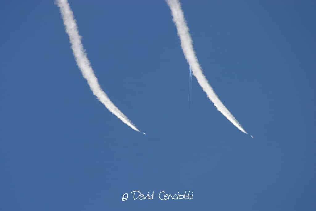 Non hanno nulla a che vedere con la chimica, neanche le condensation clouds di cui ho parlato in un precedente post (http://cencio4.wordpress.com/2006/12/19/condensation-clouds-bang-supersonici/) dovute all’effetto della rapida depressione sulle superfici di volo che porta il vapor acqueo dell’aria alla temperatura di condensazione e che si manifestano intorno ai velivoli durante l’esecuzione di manovre (specie di quelle ad alto numero di G in cui la depressione sul dorso alare subisce un notevole e rapido aumento).