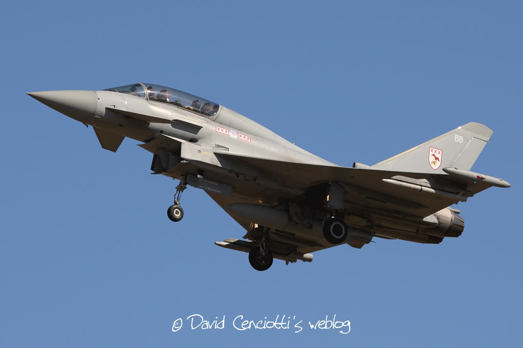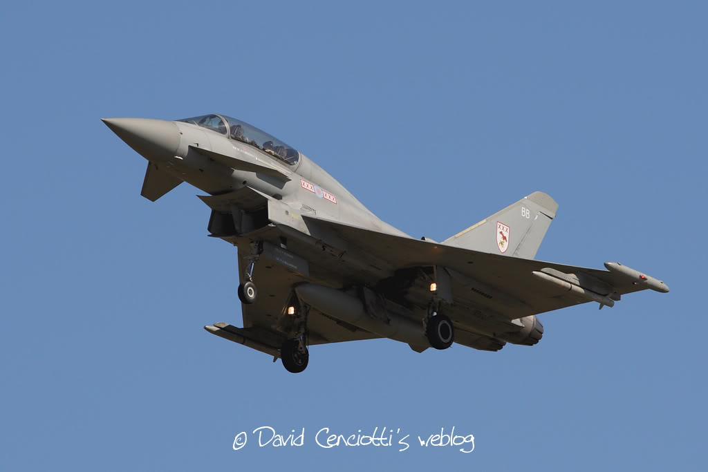 Four RAF Typhoons belonging to the 29 Sqn OCU of Coningsby are currently deployed to Grosseto to operate with the F-2000 of the 20ยฐ Gruppo OCU of the Aeronautica Militare. Adriano Bonelli took the following pictures on Jul 8 while the Eurofighters were returning to base after an air-to-air training mission in one of the operating areas used by the 4ยฐ Stormo.