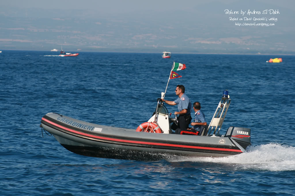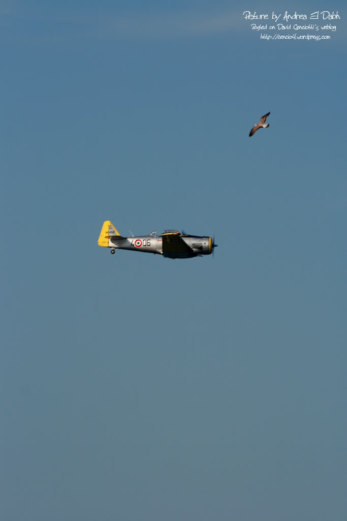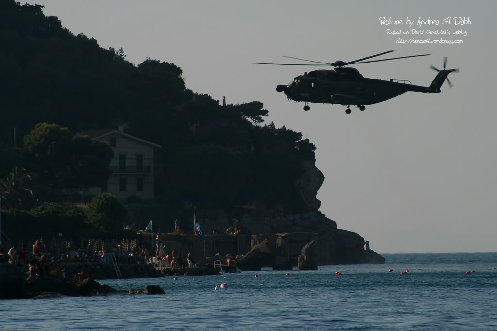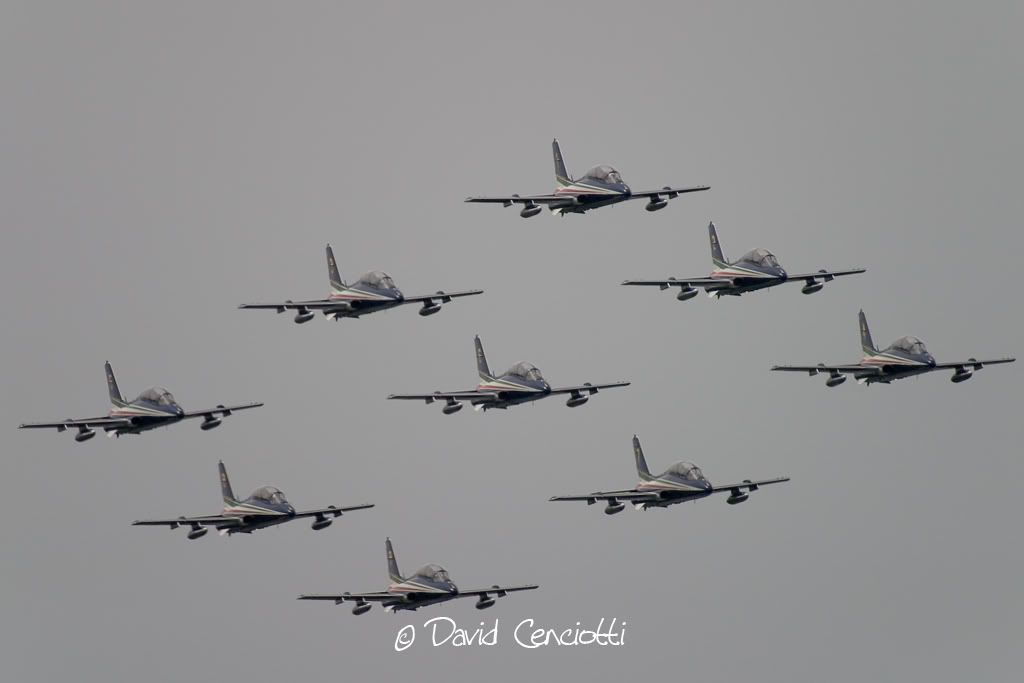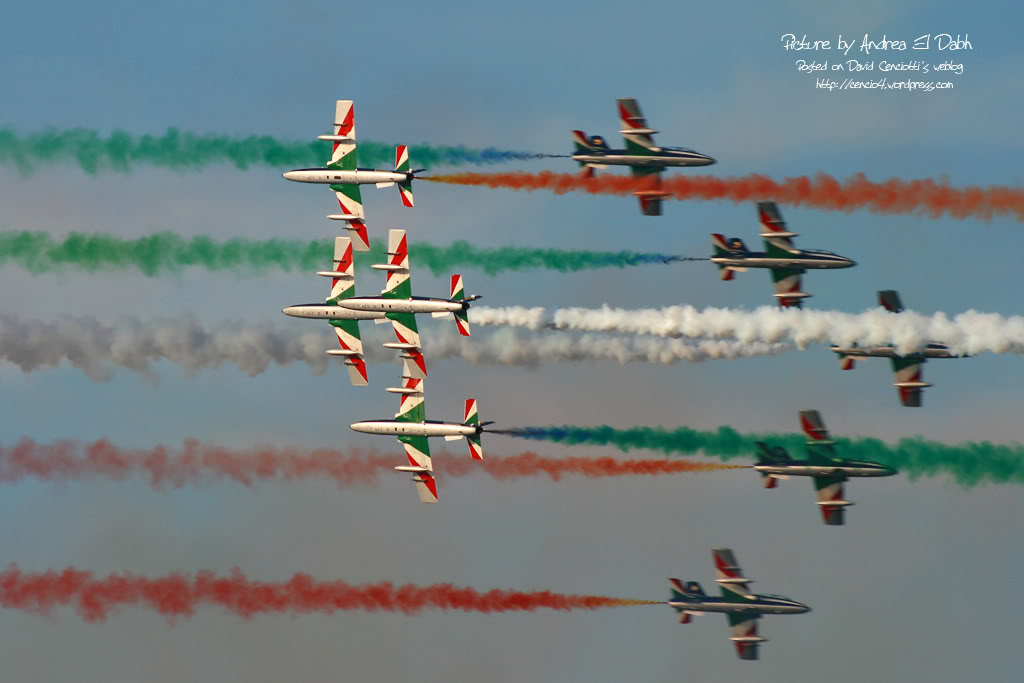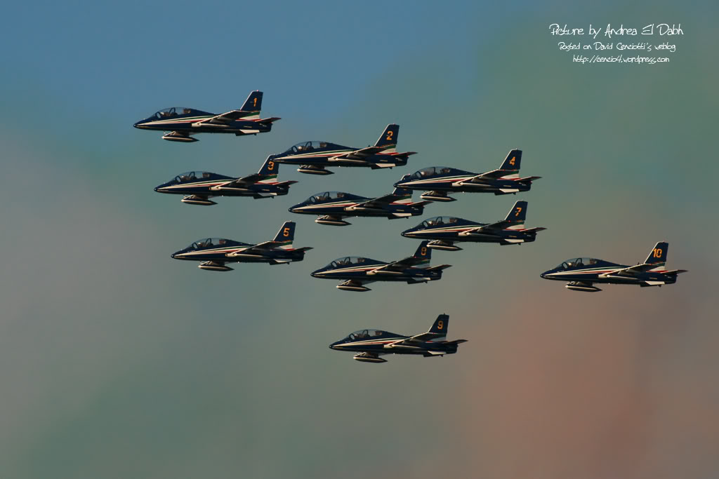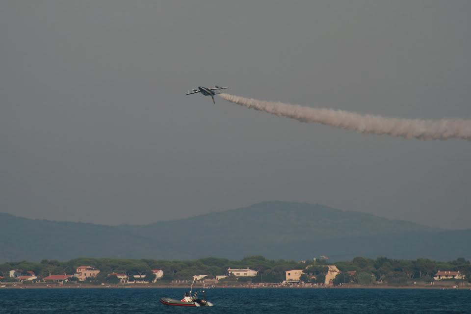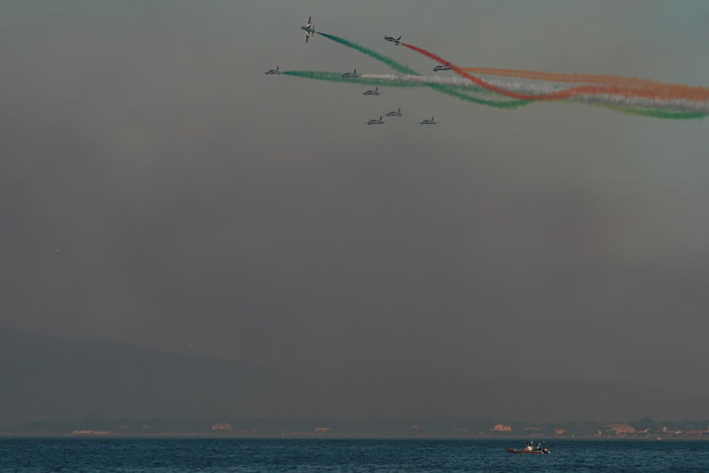 If flying “normally” could be dangerous, just think about the experience, skill and concentration required to perform aerobatic maneuvers above the water. I’ve discussed about the difficulties of a display above the waters with a friend of mine who’s a former F-104 and F-16 pilot and who’s currently flying in the Frecce Tricolori display team: Lt. Piercarlo Ciacchi, “Pony 3”. I met him during the last Giornata Azzurra, the ItAF Open Day held in Pratica di Mare airbase last May. He reminded me that initially, the air displays of the Frecce Tricolori took place only above the ground. The Frecce air display is performed by 10 aircraft (9 + 1 solo) and requires fixed reference points on the ground. In order to orientate above each airport they visit during the airshow season, the Frecce pilots project on a map of the airport the reference point they use at their homebase Rivolto. For this reason, if you hear their comms on the UHF frequency used for the display you’ll hear them referring to “Codroipo”, “Udine”, “Mortegliano” even if there are no such villages nearby: those are the villages located around Rivolto. That said, performing a display above the ground is quite easy, since you can use road, fields, rivers and railways to orientate. During the last decades the Frecce Tricolori began performing their display program above the sea, in front of the coastline. The trick was to use some floating reference points. Maneuvering above the sea during a “coastline airshow” could be even easier than performing above the ground. The main advantage is that….there are usually less obstacles. Main disadvantes are that landmarks are useful to estimate speed, heigh and distances, and improve pilot’s periferic vision and the sun’s reflection on the sea is very strong and flying facing the sunlight could be difficult in certain conditions. Even for this reason, the Frecce usually perform their display at particular hours of the day.
