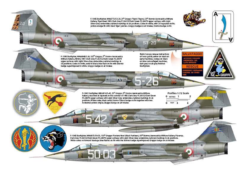 Richard J. Caruana, an established aviation author and illustrator, sent me the following file f-104-layout_low containing an interesting series of F-104 profiles. The profiles were published on MODEL AIRPLANE INTERNATIONAL no. 41, December 2008 issue, within a feature that is dedicated exclusively to operational colour schemes worn by the F-104s serving with the Aeronautica Militare (Italian Air Force, ItAF). The file also contains detailed views of the markings, stencils, roundels and bagdes of the various Italian units that were equipped with the Starfighter.