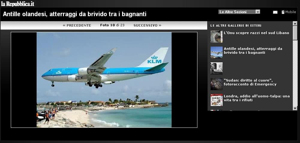 I have often criticised media inaccuracy when talking about aviation matters. Usually, this happens when aviation emergencies are technically analysed, but today’s inaccuracies have nothing to do with technical details. On Jan 9, Repubblica.it website (the most visited media website in Italy) published a set of pictures of aircraft taking off or landing in the World famous Princess Juliana (SXM) airport, located in St. Maarten, Netherlands Antilles. Most of the pictures (displayed at the following address: http://www.repubblica.it/2006/05/gallerie/esteri/isola-aeroporto-antille/1.html) are among the most viewed on Airliners.net and Jetphotos.net websites, some come from elsewhere and at least another is at least weird. The picture shows a B747-400 of an unknown company (Air Pays Bas) with registration PH-RIP and with a livery that is a mixture between the Air France and the KLM ones. That picture, that is the number 19 of the series by Repubblica.it, is obviously a fake and interestingly it is an edited version of another picture, the number 10 of the series showed.