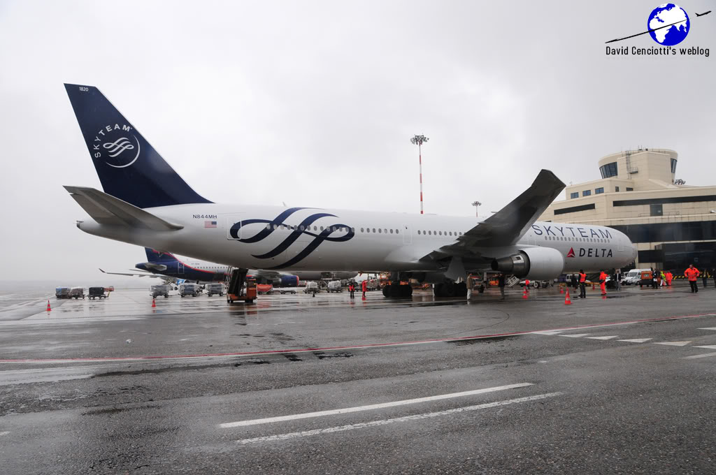 On Apr. 1, flight Delta DL74, a B764ER with registration N844MH, from Atlanta to Milano Malpensa was the first commercial flight of a plane sporting the new Sky Team livery. The livery, designed by Brandimage-Desgrippes & Laga was inspired to the alliance logo and is made by a silver fuselage with a dark blue tail with the SkyTeam logo in white. Between the wing and the tail there’s large dark blue “lace” slighlty angled (goes from top to bottom). In the forward part of the fuselage, between the cockpit and the leading edge of the wings, above the row of windows there’s a large “SKYTEAM” text in blue; below the windows there’s the red Delta logo and “DELTA” text in dark blue.