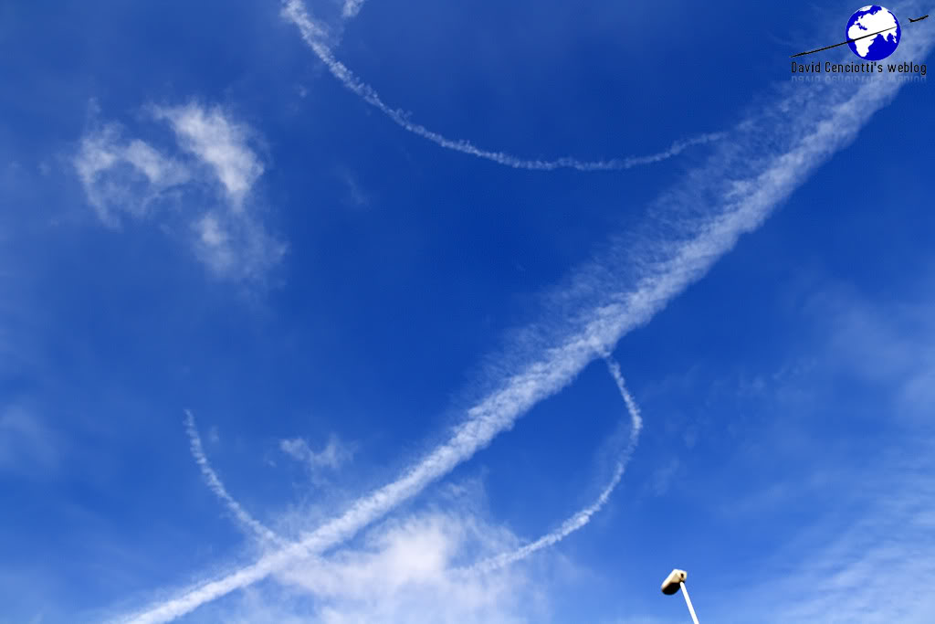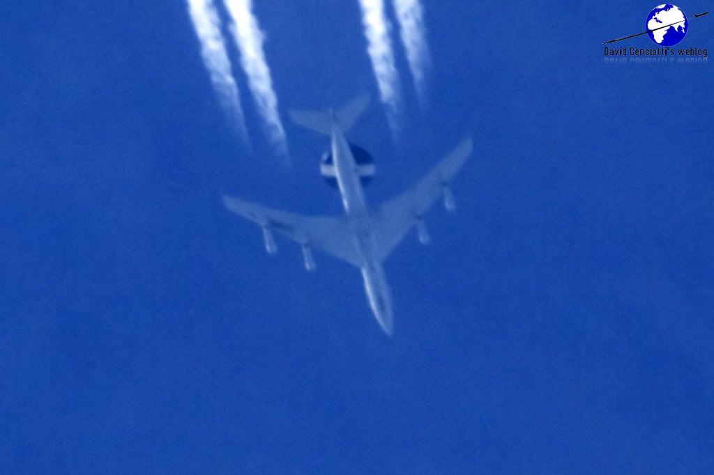 On Apr. 30, around 10.00AM LT, Fabrizio Berni noticed some contrails above Brescia and took the following interesting pictures. As the aircraft was orbiting, the shape of the contrails was (more or less) circular. The close up shows a (NATO) AWACS (radio callsign “Magic”) involved in some kind of exercise or surveillance activity in Northern Italy (thus, nothing related to the chemtrails I explained in a previous post).
