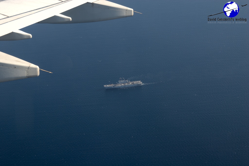 A nice picture, made by Giovanni Maduli, during the approach phase at Cagliari-Elmas airport with the Garibaldi aircraft carrier sailing below towards Cagliari harbour.
