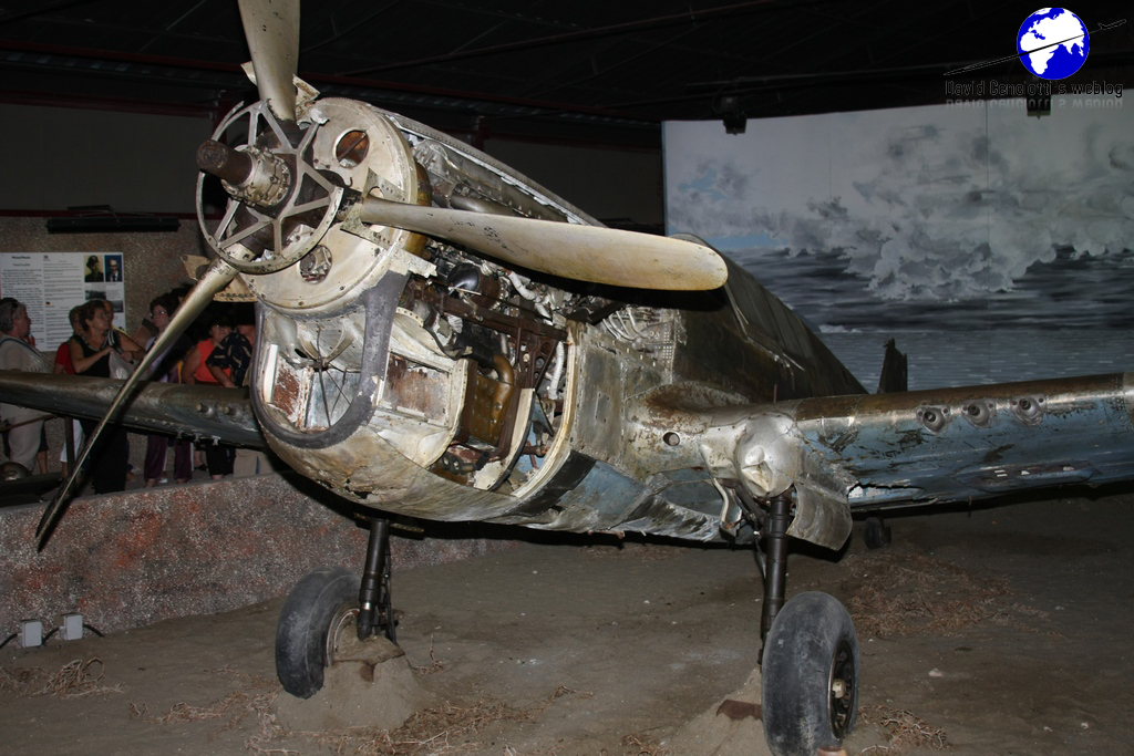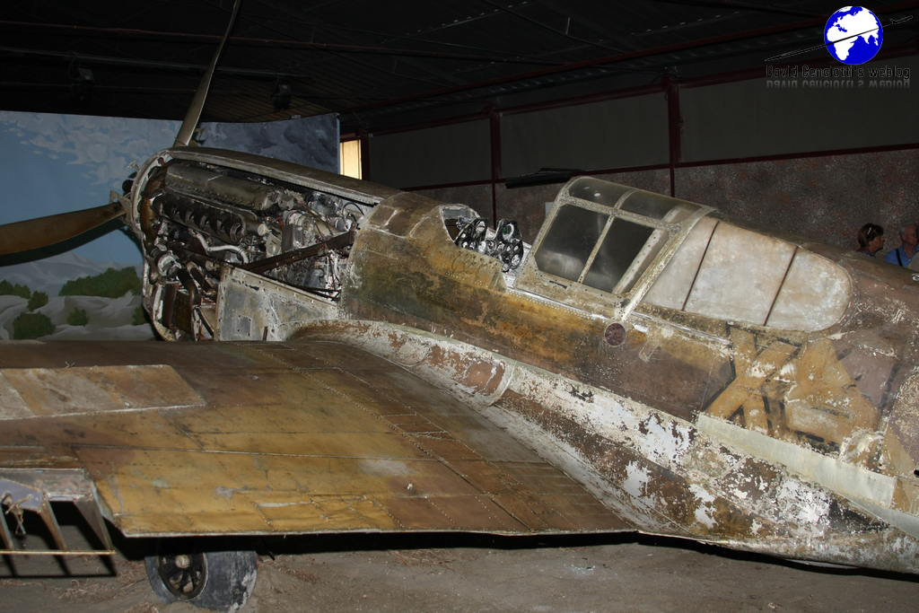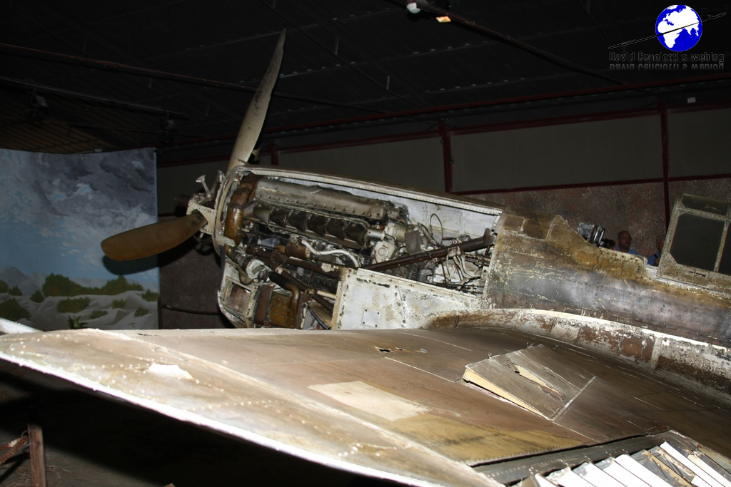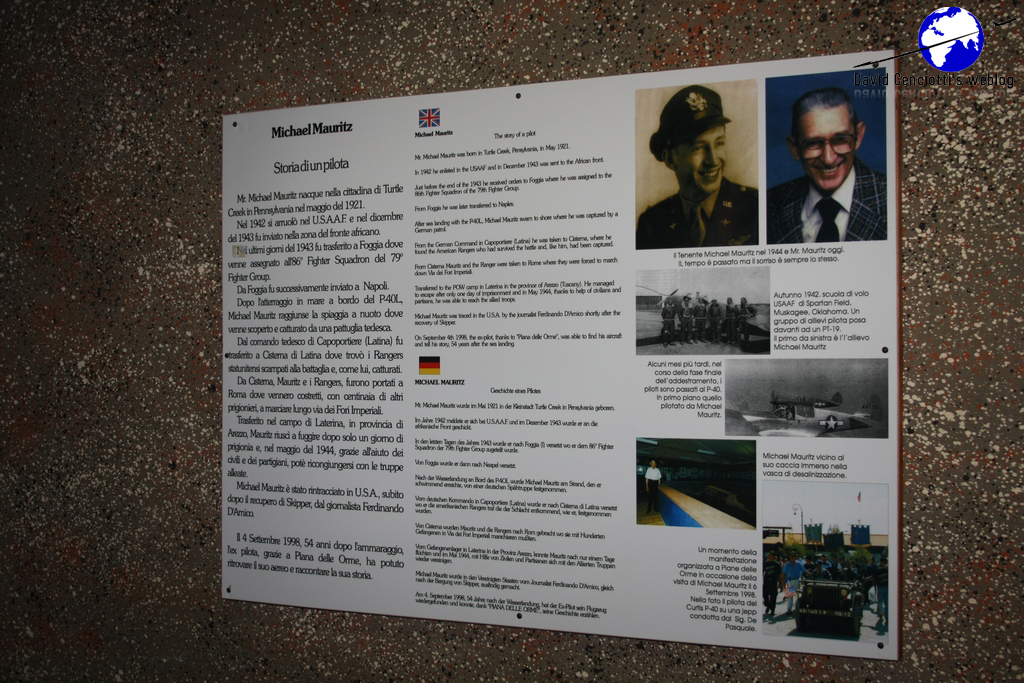 Piana delle Orme, located near Borgo Faiti some 90 kilometers to the South of Rome, is a historical park where visitors can find a heterogeneous and interesting collection that includes aircraft, tanks, locomotives, carts, models, weapons, radios. The museum’s exhibits focuses on the 20th Century. Its 14 pavilions are organized into two sections: the Agricultural Section and the War Section. The Agricultural section includes the following pavilions: Old-times Toys and Modelling (1 pavilion), Reclamation of Pontine Marshes (2 pavilions), Olden- times Farming Machines (1 pavilion), Life in the Country (2 pavilions). The War Section contains the following pavilions: Olden-times military vehicles (1 pavilion), From El Alamein to Messina and Salerno (2 pavilions), The Landing of Anzio (1 pavilion), Battle of Cassino (1 pavilion), Civilian Use of War Surplus (1 pavilion). A complete visit would take some 4 hours as each pavilion has textual boards and audio guides (available in English and German too). Interestingly both an F-104S/ASA-M (believed to be the MM6722 as the serial is missing) “9-35” formerly belonging to the 9° Stormo at Grazzanise, and an EC-119G, visible from the car park are displayed in the area between the two rows of pavilions. The EC-119G is the example MM53-8146 “46-35” an aircraft manufactured in 1953, employed by the Indian Air Force, then by the United Nations in Congo and later by the 46^ Aerobrigata of the Aeronautica Militare at Pisa. For this reason the aircraft still wears the 46^ AB markings. In 1975, the aircraft was modified and then taken on charge by the 71° Gruppo at Pratica di Mare, and used with radio callsign “Perseo 35” as an Electronic Warfare asset. The aircraft made its last flight on Oct. 31, 1979 and it was the last Fairchild “Flying Boxcar” operating in Europe. It was initially destined to the Museo Storico Aeronautica Militare (ItAF Museum) at Vigna di Valle, but after resting many years at Pratica di Mare, it was acquired by the Piana delle Orme Museum in 1998. As picture I took in August 2009 show, the aircraft is in almost perfect conditions; furthermore, an hydraulic system allows the rotation of the propellers by inserting a 2 Euro coin in a sort of parking meter. The “Sbarco di Anzio” pavilion (for the story of the famous Anzio Beachhead click here) contains the remain of a Curtiss P-40L “Warhawk”. The aircraft sank in the sea in front of Latina on Jan. 31, 1944, after a successful ditching performed by Lt. Michael Mauritz. He was flying the Curtiss P40L dubbed “Skipper” in a reconnaissance mission on Anzio when he was forced to land on sea following serious overheating problems at the engine. Althought he was able to escape the sinking aircraft and reach the beach on a lifeboat, he was taken by the Germans. Helped by partisans, he was able to escape from the prison camp of Laterina (Arezzo) and after a long and difficult escape across Italy he was able to rejoin with his unit: the 79th Fighter Group. In September 1998 Michael Mauritz was invited to Piana delle Orme for the presentation of his aircraft that was recovered from the sea-bed where it laid at a depth of 10 meters at short distance from the beach, on Jan. 11, 1998.
