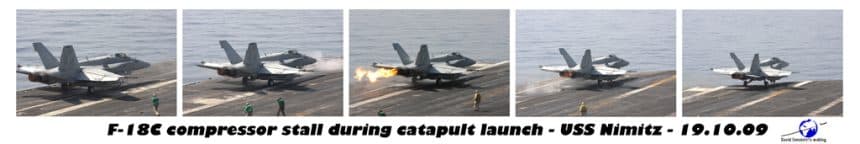 In the previous post “Compressor stall…in the worst case scenario” I explained what a compressor stall (or surge) basing on a picture I took aboard USS Nimitz. I uploaded an image within that post that I created by merging two pictures I took one after the other. Since that picture provided a view of the last few seconds of the catapult launch by a VFA-86 F-18C, I thought it could be interesting to publish the whole take off sequence that you can find here below.