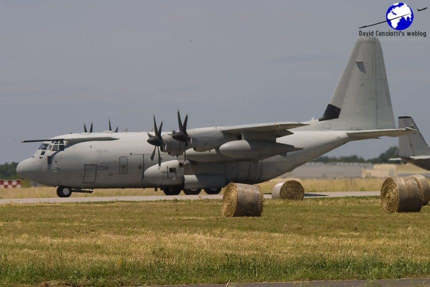 The aircraft involved was MM62176 “46-41” depicted in the picture below (that I took on May 23, 2008, at Pratica di Mare airport); it was a KC-130J, a tanker capable of performing air-to-air refueling of various types of receivers.