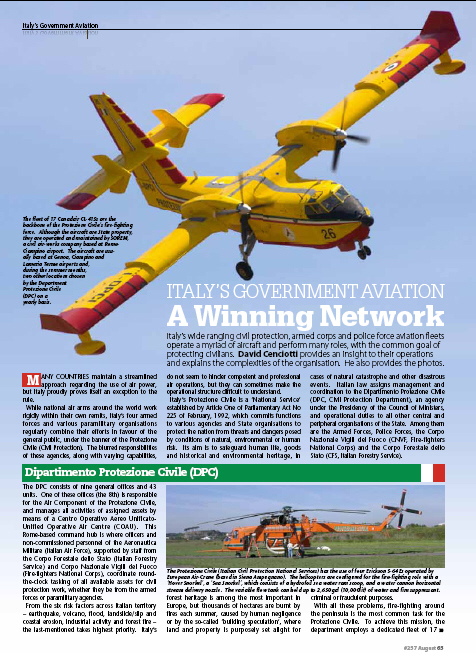 MANY COUNTRIES maintain a streamlined approach regarding the use of air power, but Italy proudly proves itself an exception to the rule. While national air arms around the world work rigidly within their own remits, Italyโs four armed forces and various paramilitary organisations regularly combine their efforts in favour of the general public, under the banner of the Protezione Civile (Civil Protection). The blurred responsibilities of these agencies, along with varying capabilities, do not seem to hinder competent and professional air operations, but they can sometimes make the operational structure difficult to understand. Italyโs Protezione Civile is a โNational Serviceโ established by Article One of Parliamentary Act No 225 of February, 1992, which commits functions to various agencies and State organisations to protect the nation from threats and dangers posed by conditions of natural, environmental or human risk. Its aim is to safeguard human life, goods and historical and environmental heritage, in cases of natural catastrophe and other disastrous events. Italian law assigns management and coordination to the Dipartimento Protezione Civile (DPC, Civil Protection Department), an agency under the Presidency of the Council of Ministers, and operational duties to all other central and peripheral organisations of the State. Among them are the Armed Forces, Police Forces, the Corpo Nazionale Vigili del Fuoco (CNVF, Fire-fighters National Corps) and the Corpo Forestale dello Stato (CFS, Italian Forestry Service).