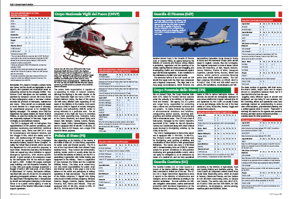 The DPC consists of nine general offices and 43 units. One of these offices (the 8th) is responsible for the Air Component of the Protezione Civile, and manages all activities of assigned assets by means of a Centro Operativo Aereo Unificato- Unified Operative Air Centre (COAU). This Rome-based command hub is where officers and non-commissioned personnel of the Aeronautica Militare (Italian Air Force), supported by staff from the Corpo Forestale dello Stato (Italian Forestry Service) and Corpo Nazionale Vigili del Fuoco (Fire-fighters National Corps), coordinate roundthe-clock tasking of all available assets for civil protection work, whether they be from the armed forces or paramilitary agencies. From the six risk factors across Italian territory โ earthquake, volcano, flood, landslide/slip and coastal erosion, industrial activity and forest fire โ the last-mentioned takes highest priority. Italyโs forest heritage is among the most important in Europe, but thousands of hectares are burnt by fires each summer, caused by human negligence or by the so-called โbuilding speculationโ, where land and property is purposely set alight for criminal or fraudulent purposes. With all these problems, fire-fighting around the peninsula is the most common task for the Protezione Civile. To achieve this mission, the department employs a dedicated fleet of 17 Bombardier CL-415s, based in Ciampino, Lamezia Terme and Genoa, but the aircraft are deployable to other airports, and operated and maintained under an outsourcing contract by the company SOREM. Four Erickson S-64E helicopters are also available, and operated by European concern Air-Crane (based in Siena Ampugnano) under a โwet leaseโ contract (includes the provision of helicopters, maintenance and crews). Other aircraft are occasionally leased to boost numbers for a single season if necessary, for experimental purposes or for multiple firefighting campaigns. For example, since 2006 the Department has leased Avialsaโs Air Tractor AT-802F FireBoss, an asset that during the summer of 2008 was temporarily deployed to Falconara, Foggia and Grottaglie, as a precautionary measure. The DPC is equipped with six helicopters: Five Agusta Westland A-109s perform surveillance, antipollution monitoring and MEDEVAC (MEDical EVACuation) tasks, while one AW139 is used for reconnaissance and transport missions, and four Piaggio P.180s, which are mainly used for short- and medium-range VIP transport. These four aircraft are operated by the Compagnia Aeronautica Italiana, based in Rome Ciampino. In reality, the โvirtualโ fleet of aircraft, which can serve the department for civil protection purposes, is much wider. Should the need arise, the Protezione Civile can request any other institution to support emergency operations, with mission-specific aircraft. A good example is the emergency caused by the earthquake that hit the Abruzzo region on April 6, 2009. It killed 300 people, destroyed many buildings and left thousands homeless, but to help with post-quake damage assessment a Piaggio P.166DL3 APH twin-prop, of the Pratica di Mare-based 14ยฐ Stormo, Aeronautica Militare, was fitted with Leica RC-20 and RC-30 cameras for gathering photographic evidence. Also, every year the departmentโs fire-fighting fleet is strengthened by aircraft and helicopters belonging to the Armed Forces or to a public service agency, or even by French assets of the Sรฉcuritรฉ Civile under a mutualsupport agreement.