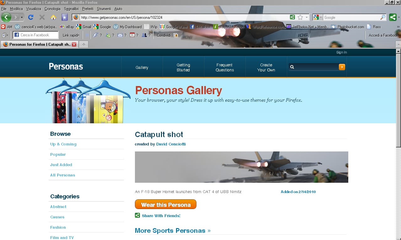 Personas are easy-to-install themes that change the look of your Firefox web browser. They are different from themes since they change just the look of the browser without changing the navigation buttons, toolbars and menus, like themes do. On Firefox 3.6, with Personas you can instantly preview a design and install it in one click without needing to restart and without needing any add-on. It’s free and simple. There are thousands personas available for your browser. Since there was a lack of aviation related personas, I decided to create a new one that I named “Catapult shot”.