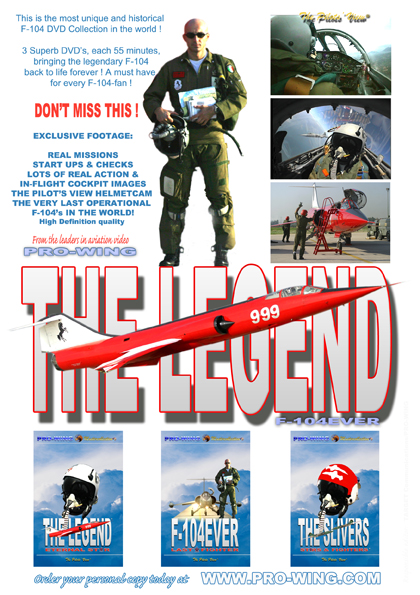 In the last days I had the opportunity to watch the last two DVDs dedicated to the F-104 produced by Pro-Wing International; those filmed in October 2004 that focus on the very last days of the F-104 at Grazzanise, the airbase where the (operative) career of the Starfighter ended on Oct. 31, 2004. Respectively titled “F-104EVER: the last STAR fighter” and ““THE LEGEND: Eternal Star”, the two DVDs represent the two episodes of an extremely interesting movie produced by Luc Delestinne, the famous aviation film maker and producer whose Pilot’s View® mini-cameras among the few ones in the world to be “flight-safety approved”, meaning that they can be even attached to the pilot’s helmets or masks to provide some of the most dramatic in-flight views ever seen. In the last period, while preparing my latest book on the F-104, I’ve re-examined all the material about the “Zipper” I’ve collected during the years. After reviewing all the videos ever produced on this subject I think Delestinne’s last work is a masterpiece as the movie not only provides footage of the real life at the base, preflight checks, engine start-up (from both pilot’s and crew’s perspective) but, through the use HD cameras and micro-cameras, it allows the viewer to discover the pilot’s point of view and to experience the thrill of taking off, flying and landing (even in emergency…) with the “Spillone”, of piloting the famous special coloured 9-99 or of performing aerobatic manoeuvers in formation with another Starfighter. I think the following trailer gives an interesting preview of the contents of the DVDs (noteworthy, the following Youtube video refers to the entire F-104 collection produced by Pro-Wing that couples the above mentioned movies with “The Slivers: Stars & Fighters”, that deals with the famous Belgian Air Force Starfighter team with historical footage of the close formation team):