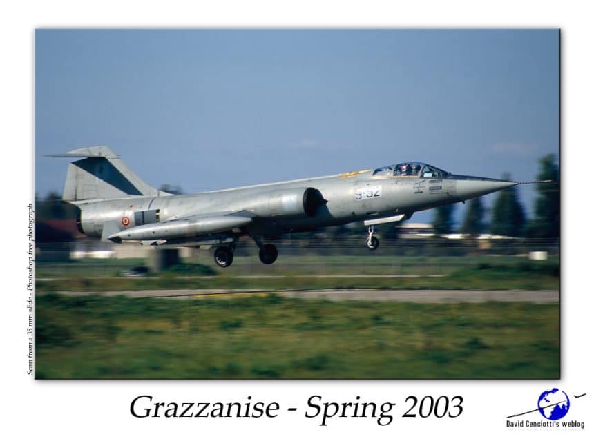 After reading some news dealing with the presumed imminent return to flight of an airworthy Italian F-104 (obviously hoaxes related to the April Fool’s Day), I decided to publish the following postcard made with a picture I took more or less in this period, 7 years ago, in 2003. The image, a scan from a 35mm colour slide, depicts an F-104S ASA-M of the 10ยฐ Gruppo landing on runway 06 at Grazzanise airbase. It is “Photoshop free” (frame aside, of course): a genuine photograph of the F-104 in a day in which many Starfighter-related hoaxes are spreading through the Web.