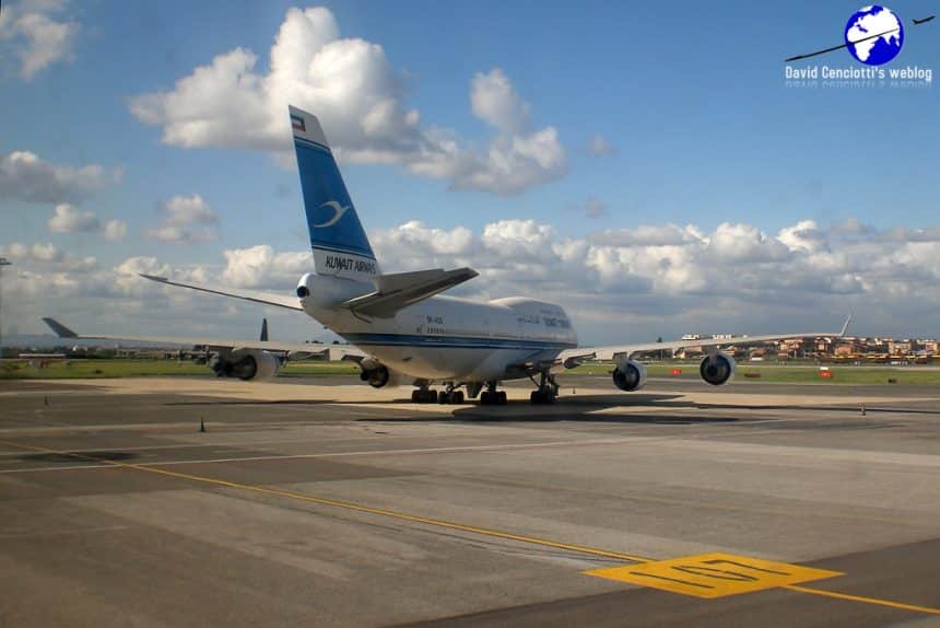 The following pictures were taken by Andrea El Dabh (whose site can be visited at the link https://sites.google.com/site/aereiedintorni/) at around 17.00LT on May 5, 2010 while he was boarding a Ryanair flight. The images show a quite unusual visitor at Ciampino airport, the B747-400 “9K-ADE”. The same aircraft, along with a State of Kuwait A-320 had visited Malpensa on May 2, 2010.