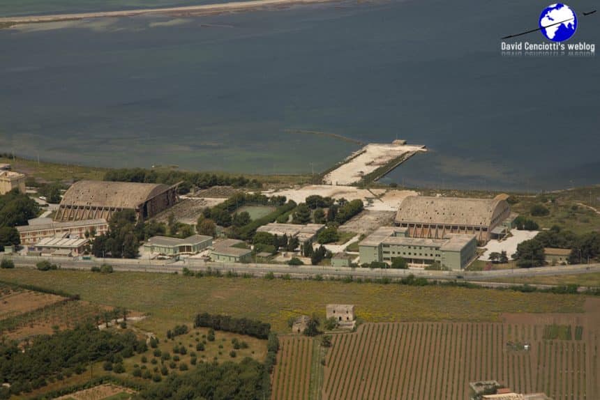 During the same flight I recalled in the above mentioned article, Giovanni Maduli was able to took a picture of the area and the remains of the seaplane station, comprising the two famous hangars, nicknamed “Nervi Hangars”. Following the Allied invasion of Sicily on Jul. 13, 1943, the 144^ Squadriglia was moved to Orbetello and the 197^ to Lago Patria, near Naples, where they were disbanded.ย After the war, the hangars were used to recover materials, equipment and vehicles from Catania and Boccadifalco (Palermo) airports.