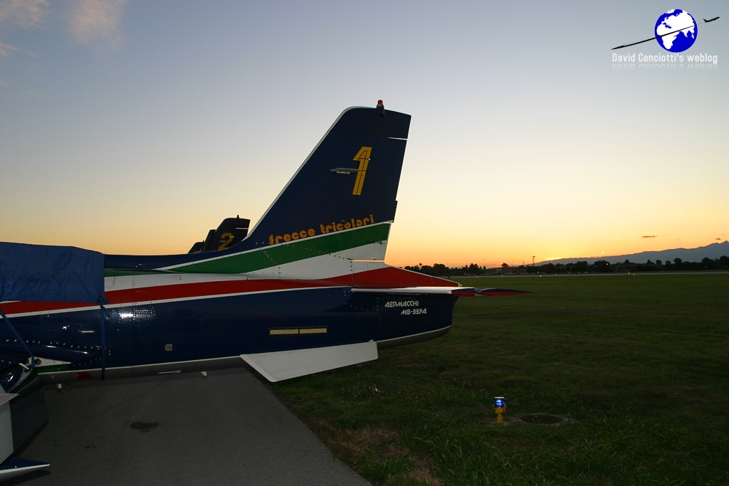 The following images I took at sunset of Sept. 10 (just a few hours ago) show the MB.339s of the Frecce Tricolori lined up at Rivolto airbase for the night preceeding the 50th Anniversary airshow (10° Raduno Piloti Pattuglie Acrobatiche, Aerobatic Team Pilot Reunion).