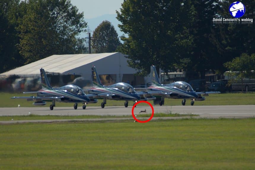A “near miss” (that is an unplanned event that did not result in injury, or damage although having the potential to do so) wildlife strike involving a rabbit occurred during the recent airshow held in Rivolto to celebrate the 50th Anniversary of the Frecce Tricolori. As the interesting picture below, taken by Giovanni Maduli shows, on Saturday Sept. 11, while the first section of five Alenia Aermacchi MB.339A/PANs of the Pattuglia Acrobatica Nazionale (Italian Aerobatic Team) was taking off for the last display of the day, a hare crossed the runway 06 not far from the aircraft number 1, flown by the leader of the Frecce Tricolori. Fortunately, the animal was fast enough to complete the crossing without being hit by any of the five aircraft, but this exclusive picture reminds us that strike hazard for both military and civilian aviation does not only come from flying animals but also from the ones on the ground living in the vicinity of airports.