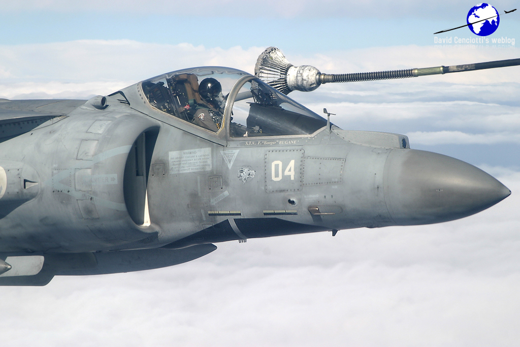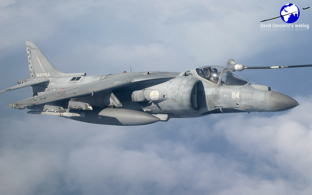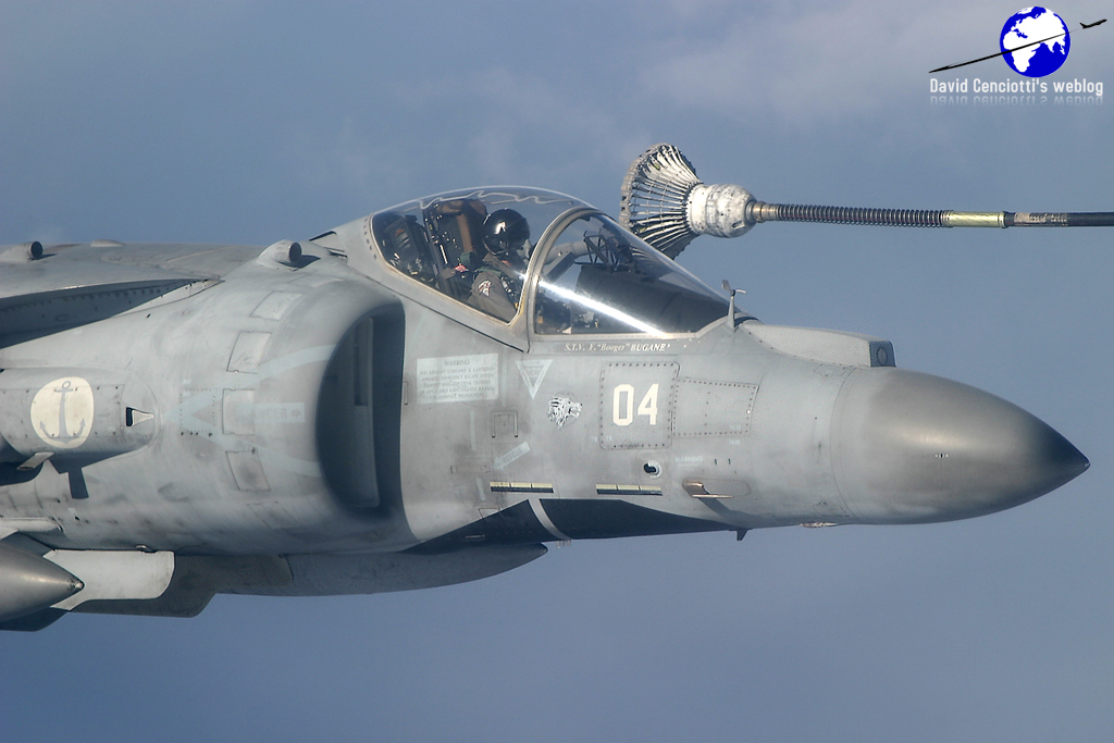 Below, AV-8B+ Harrier of the Marina Militare refueling from a B707 tanker.