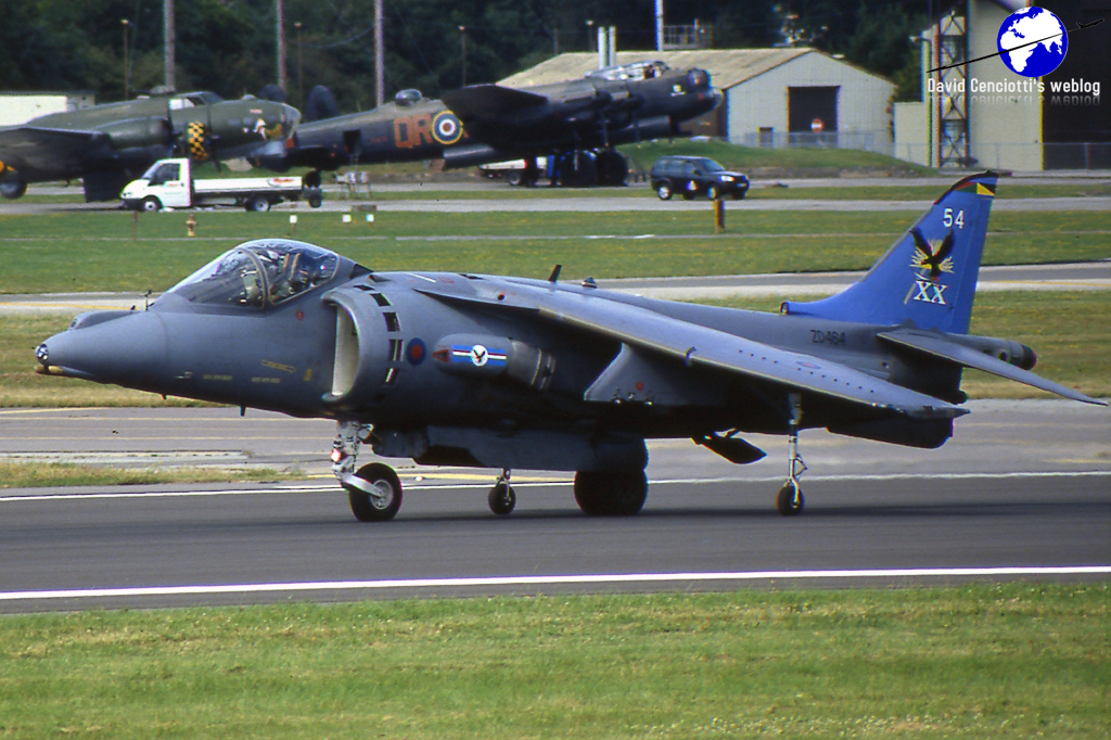 Two RAF Harrier GR7s (the left one photographed during an air-to-air refueling mission on board a Spanish KC-130 from Aviano in 2000; the right one taking off during RIAT 2002).
