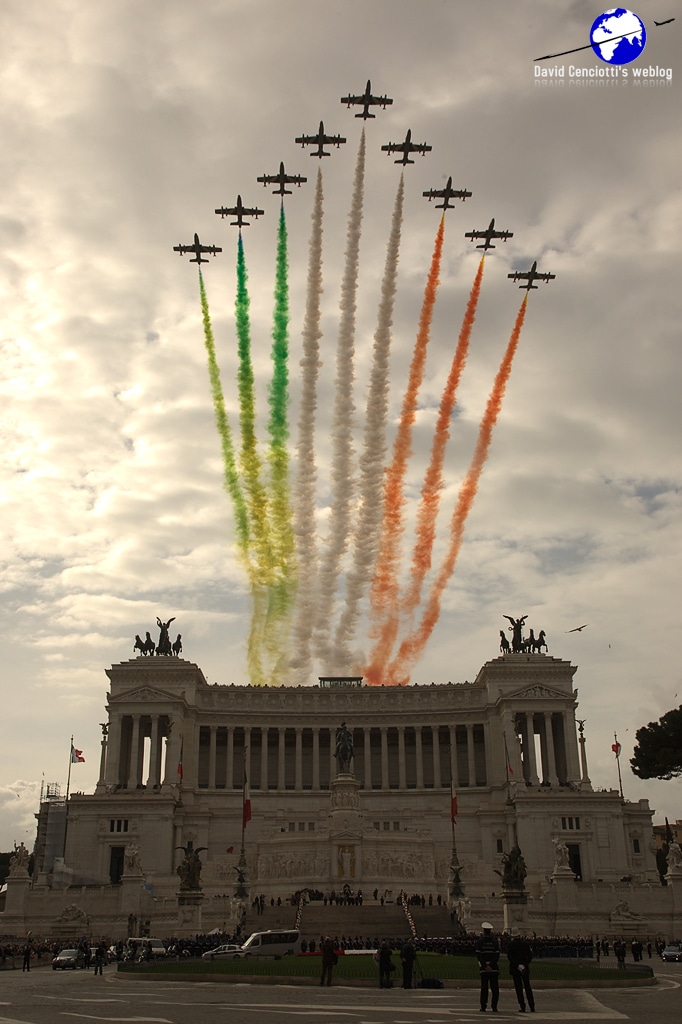 On Mar. 17, 2011, Italy celebrated the 150th Anniversary of its unification as a single state. One of the most important events planned around the country to commemorate the proclamation of the Kingdom of Italy under Victor Emmanuel on Mar. 17, 1861 saw President Giorgio Napolitano and major Italian authorities paying homage to the tomb of the Milite Ignoto (Unknown Soldier) at the Altare della Patria (Altar of the Fatherland) on Piazza Venezia, Rome while the Frecce Tricolori of the Aeronautica Militare streamed green, white and red smoke in the colours of Italy’s flag overhead. Giovanni Maduli took the following pictures of the ceremony.