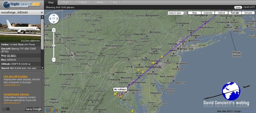 One or two days ago, I read that Flightradar24.com had added a new feeder in Washington DC. So, on Sunday May 08, 2011 at 19.50 GMT I thought it would be nice to try to see which kind of traffic crosses the airspace in the DC area. As soon as I moved the cursor on the East Coast of the CONUS I noticed an aircraft showing the “No Callsign” label. I clicked on it and what I saw really struck me: