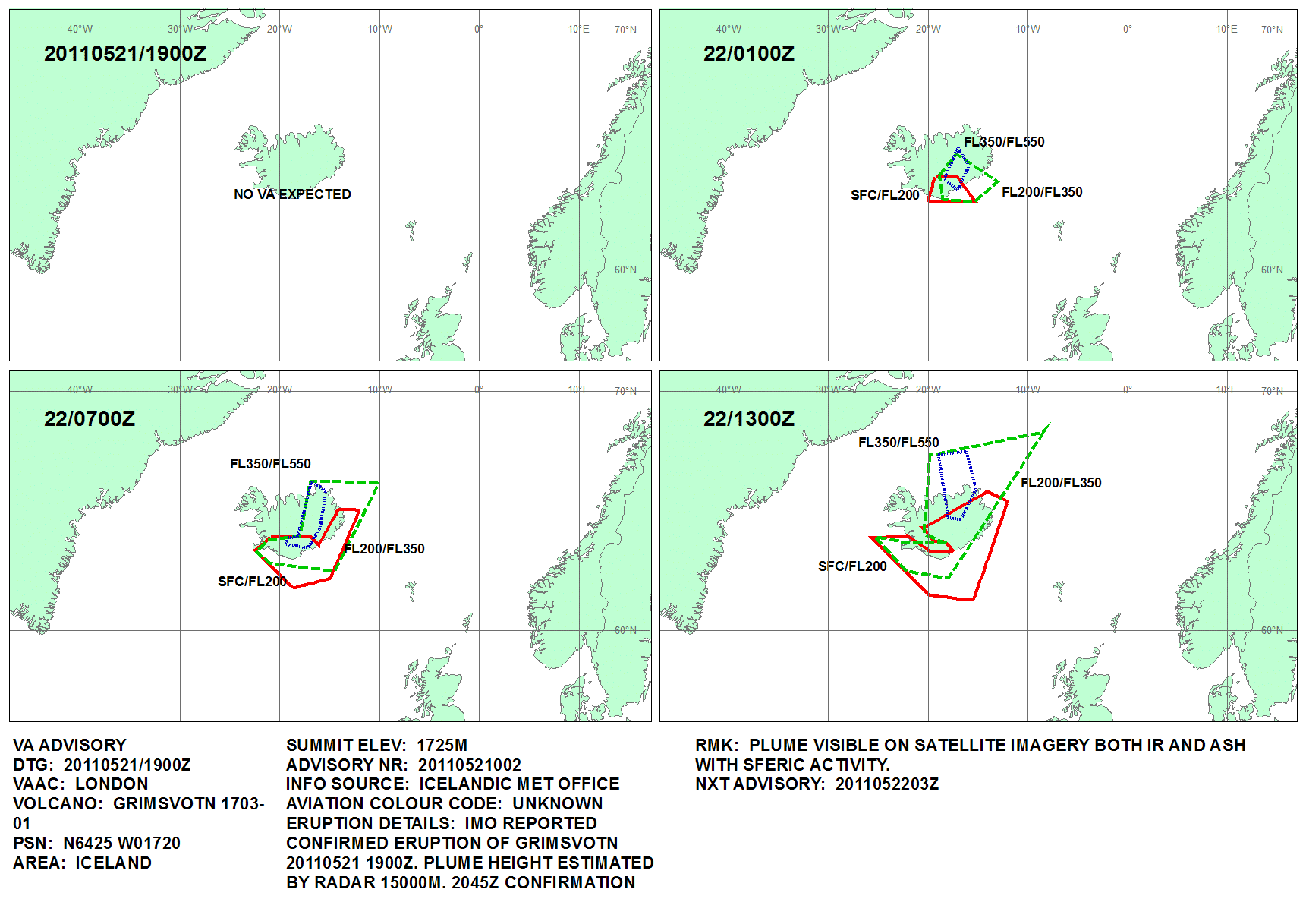 At around 19.30LT on May 21, 2011, Grรญmsvรถtn volcano in Vatnajรถkull Glacier. According to the first report by the UK Met office the plume height estimated by radar reaches 15.000 mt and it was also confirmed from an aircraft at 12 km or more. Even if geologists say that flight disruption is unlikely, a no-flight safety zone was established 120 nautical miles around the area as a precautionary measure.