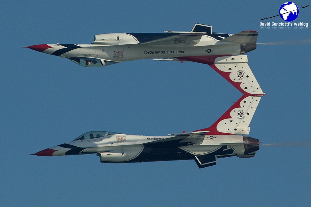 People that are not used to see a USAF demo team display always wonder why Thunderbird 5 has its number painted on upside down: as these pictures show, in mirror flybys, the inverted F-16s is always number 5. Since that solo flies inverted most of the routine, its “5” almost always appears in the correct position to observers on the ground.