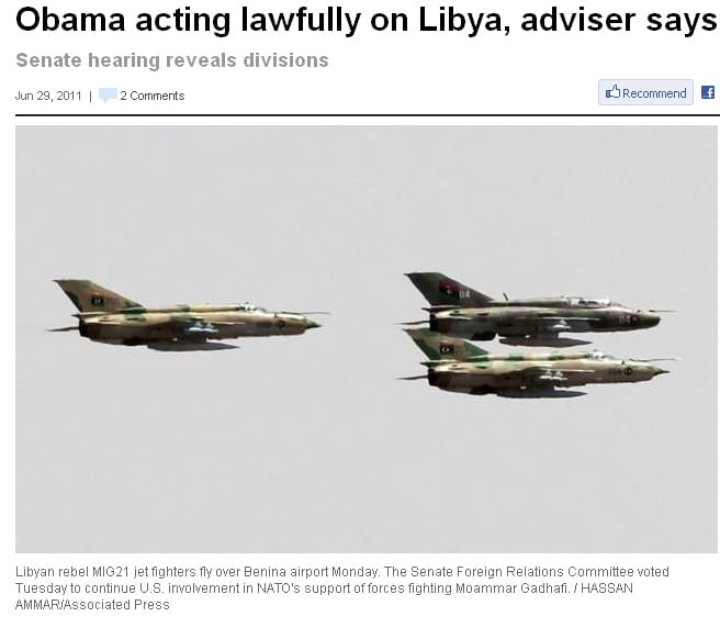 Thanks to a post on the ACIG.org forum, I found an article published on the Detroit Free Press titled “Obama acting lawfully on Libya, adviser says” that shows an extremely interesting picture of three FLAF (Free Libya Air Force) Mig-21s over Benina airport. The article was published on Jun. 29 and the picture was taken (according to the caption) on Jun.27.