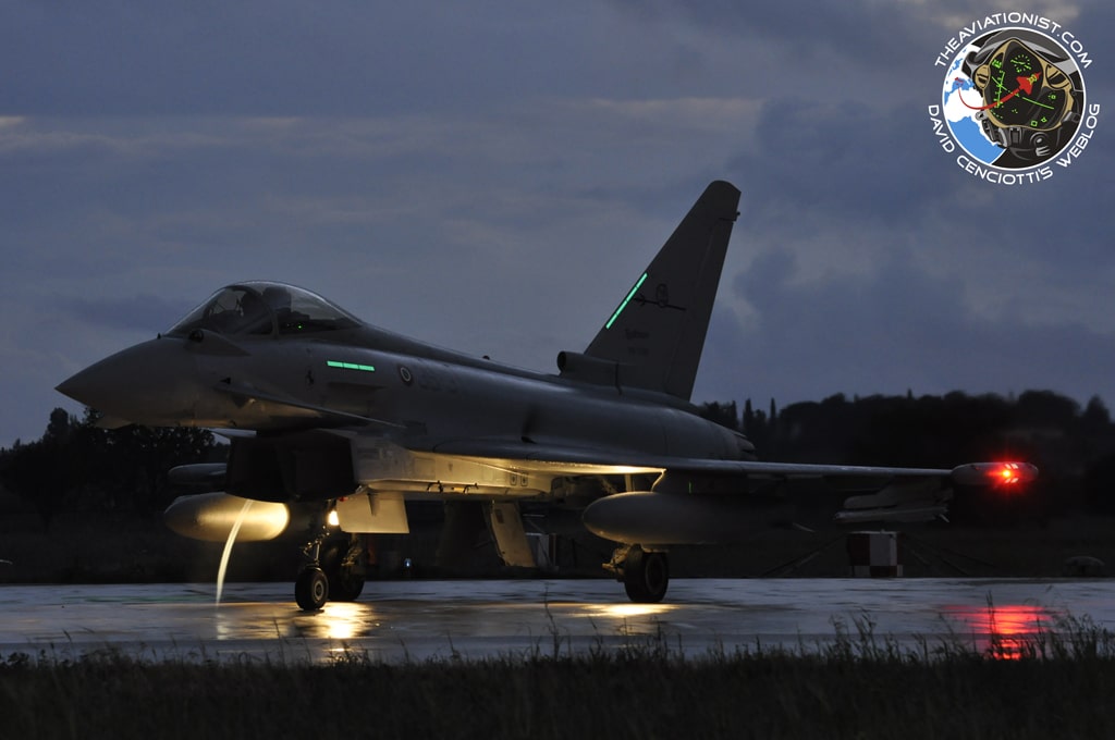 The picture was taken in May 2011, by Nicola Ruffino and shows a Typhoon of the 36ยฐ Stormo, based at Gioia del Colle, generating a vortex on the apron before taxiing for night sortie.