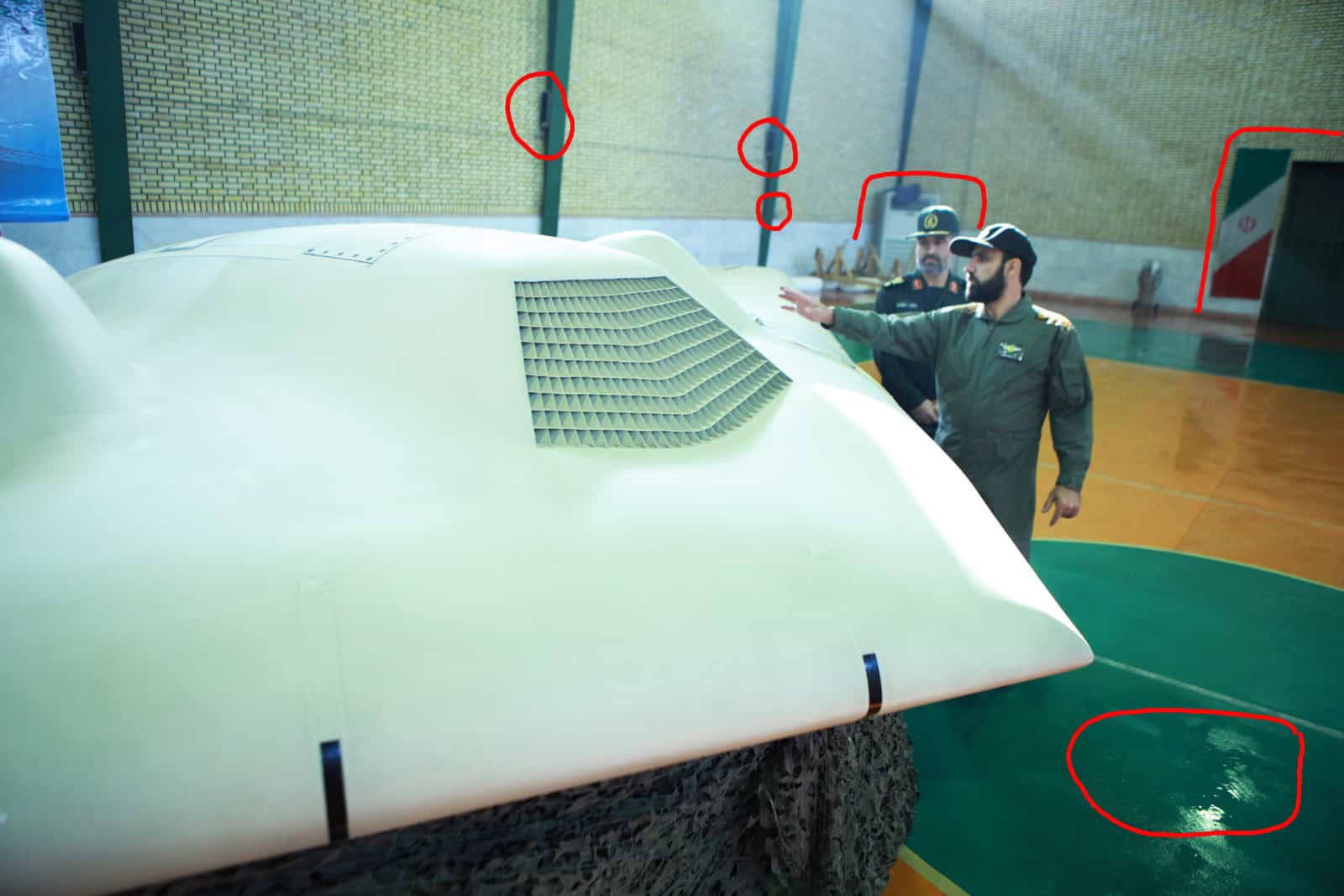 5) Probably, the bottom of the airframe is carefully hidden because the drone was seriously damaged as a consequence of the crash landing. Why did the Iranians want to cover it? Maybe because the type of damage would be coherent with a belly landing, without an extended undercarriage. This would prove that the drone was not remotely controlled by Iranian operators that have been able to disrupt the satellite link and guide it to a “safe” landing. On the other side, a completely uncontrolled landing would have had more evident effects on the airframe.