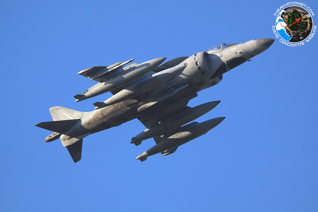Taken on Jan. 17 by Giovanni Maduli, the following picture shows an Italian Navy AV-8B+ Harrier taking off from Decimomannu airbase in a heavy configuration including 4 x 300 gallons fuel tanks, used for long range ferry flights.