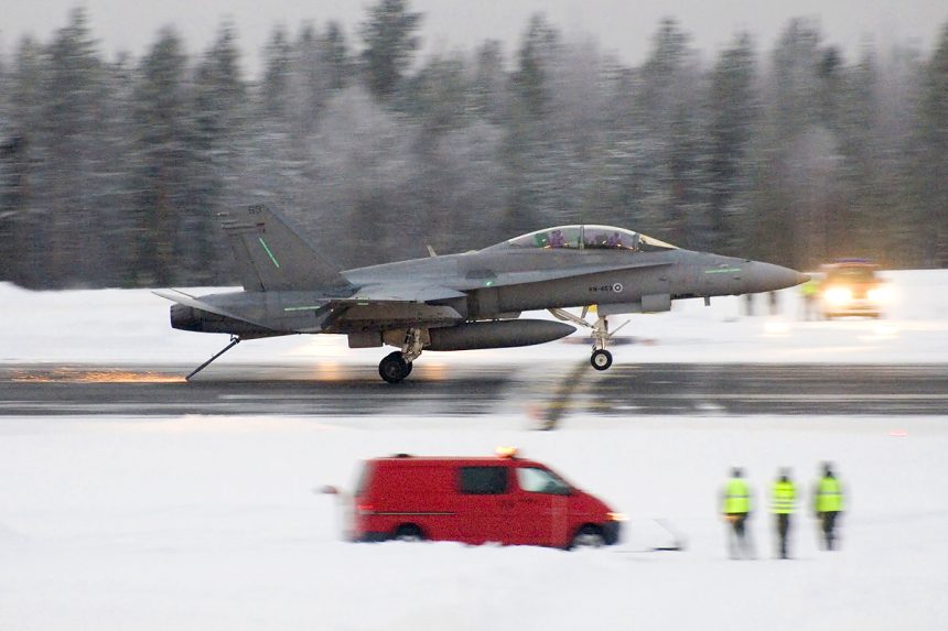 Published by Lt. Gen. Jarmo Lindberg, commander of the Finnish Air Force, on his Twitter timeline few days ago, the following picture (by Harri Koskinen) shows a F-18D Hornet routine arrested landing practice at Rovaniemi on the Arctic Circle.