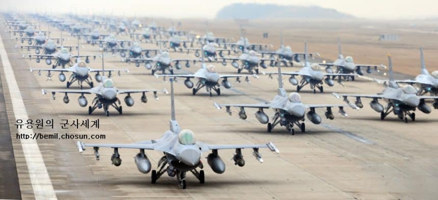 If I was able to correctly translate what the Chosun website says, the ones below show 60 U.S. F-16s and South Korea’s ROKAF KF-16s taxiing down the runway at Kunsan airbase during an exercise.
