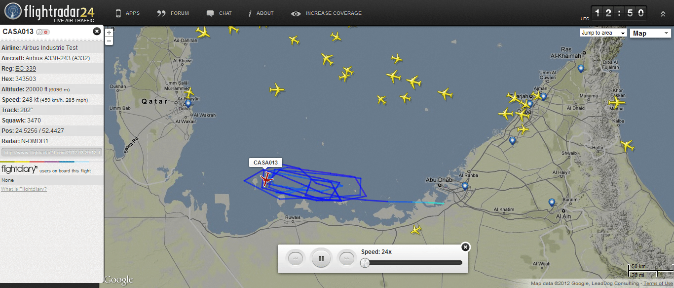 For instance, using the radio callsign “CASA 013” the A330 EC-339 could tracked on Mar. 20, 2012 performing a refueling mission between FL240 and FL280. Click here to see the route followed by the MRTT during that sortie.