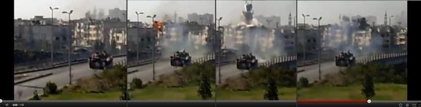 This video was uploaded on Mar 30 and is said to be from Homs. Bjรธrn believes the tank has fired one round just before the video starts – and later the footage shows three more rounds being fired.