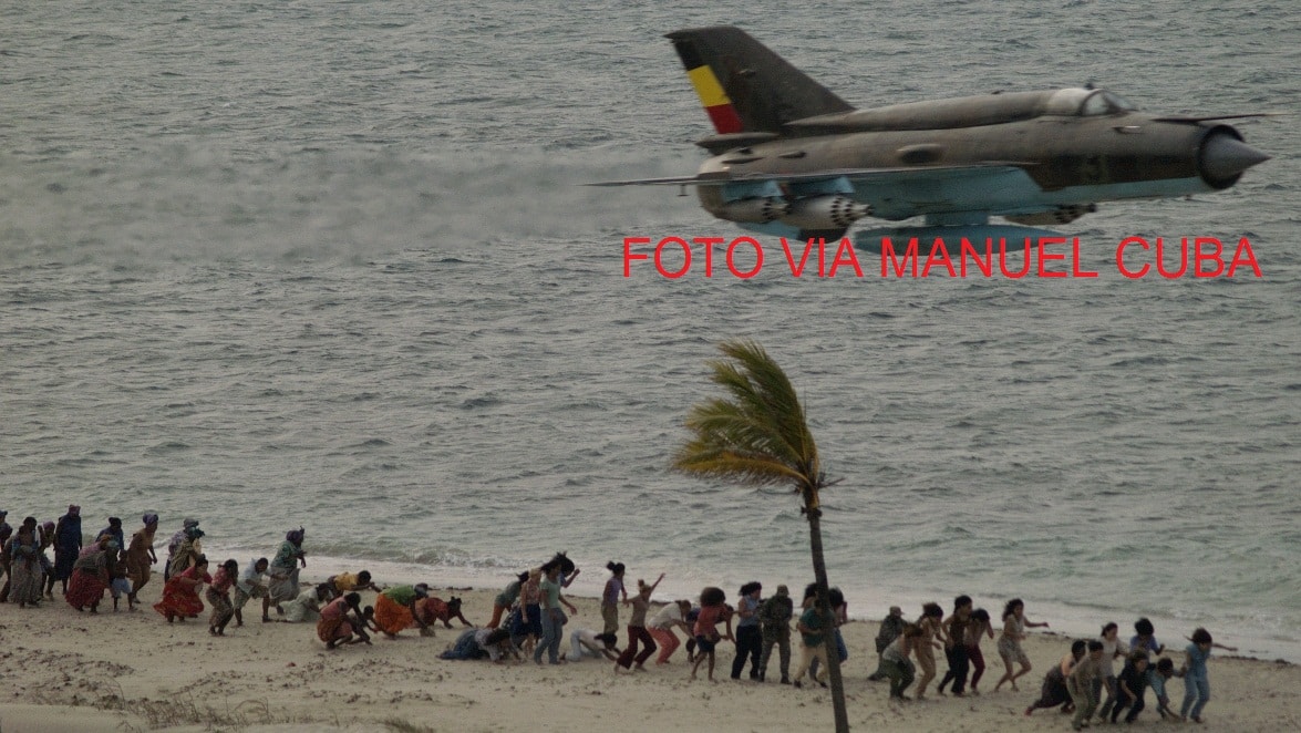 Here’s an image published on this blog (thanks to Emiliano Guerra for the heads-up) showing an armed Cuban Mig-21 in Angolan markings performing a low altitude flyby on a Cuban beach during the filming of Kangamba.