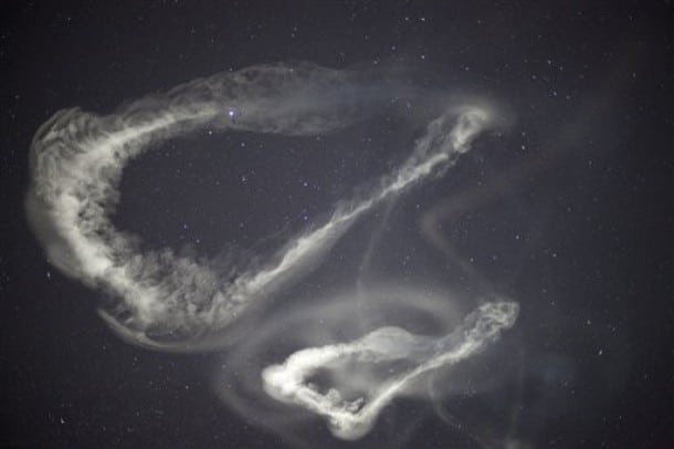 They show chemical tracers that were released from five rockets launched from NASA’s Wallops Island test flight facility in Atlantic, Virginia, in the morning of Mar. 27, 2012, as part of the Anomalous Transport Rocket Experiment (ATREX).