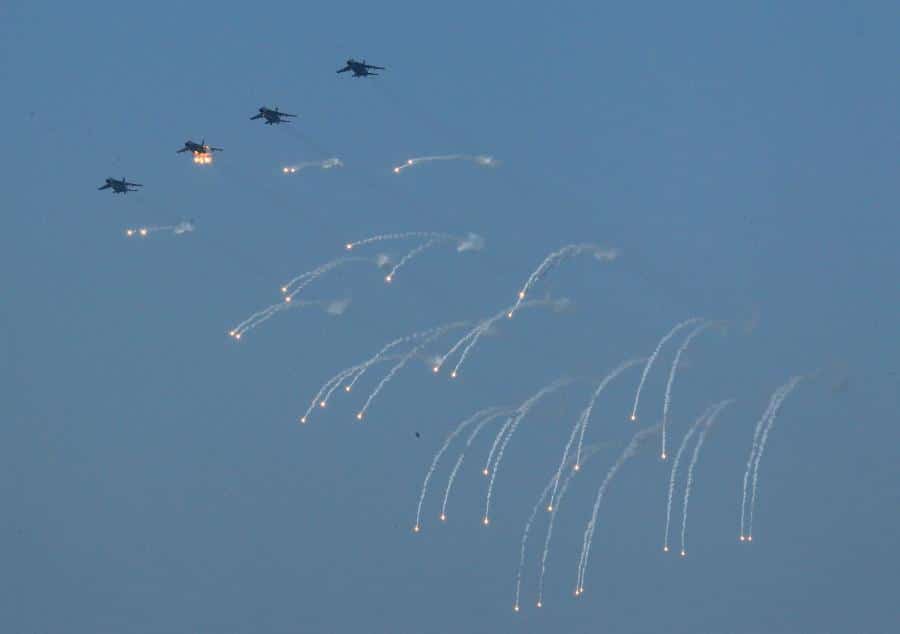 Among the warplanes that performed the flyover of the fleet, there were also some People’s Liberation Army Navy Xian JH-7s and J-11s that made abundant use of flares, as the following image, published by Xinhua News Agency show.