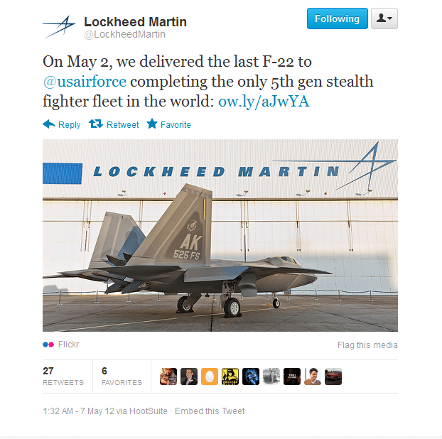 As done by Northrop Grumman, that tried to reverse Pentagon’s decision to cancel the Global Hawk Block 30 program with the help of Twitter, Lockheed Martin has entrusted tweets (along with images on Flickr) to claim some of the Raptor’s unmatched capabilities and performance.