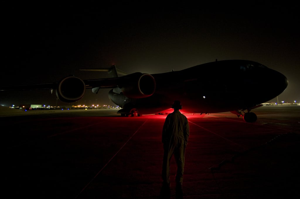 A C-17 Globemaster II performs pre-flight checks and engine start up in front of a loadmaster of the 816th Expeditionary Airlift Squadron in a picture taken at “an undisclosed location in Southwest Asia” on May 4, 2012.