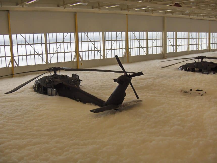 Thet show the hangar floor and eight helicopters covered with 7 feet of foam at the Army Aviation Support Facility (AASF #2) at the St. Cloud airport. Barely visible (hence “stealthy”…) below the foam are UH-60 Black Hawk helicopters most probably belonging to the local based C Company, 2nd General Support Aviation Battalion, 211th Aviation Regiment (Air Ambulance), a Minnesota Army National Guard aeromedical evacuation company.