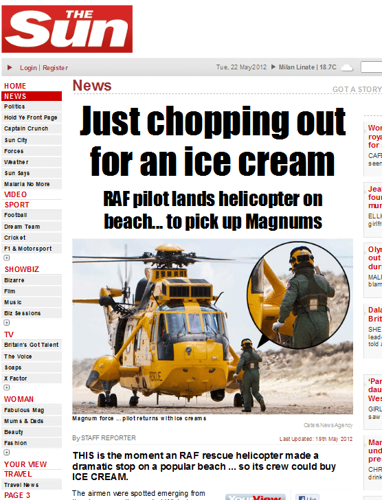 The Sun has published some interesting pictures showing a RAF rescue Sea King helicopter landing on a beach during a training sortie to give a crew member the opportunity to buy ice creams.