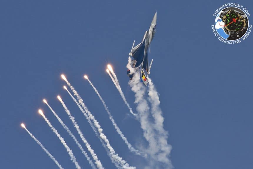 The F-16 MLU released several flares, aerial infrared countermeasures made of a composition based on hot-burning metal used to counter heat seeking air-to-air or surface-to-air missiles: flares generate temperatures equal to or hotter than engine exhaust attracting the missile’s seeker head.